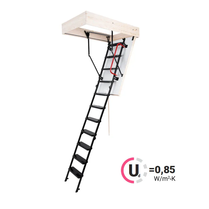 Складная 4-х секционная чердачная лестница. Рабочая поверхность полностью выполнена из алюминия. Термоизоляционная крышка типа "сэндвич" имеет усиленную теплозащиту, облицована с двух сторон ДВП белого цвета. По контуру короба имеется уплотнитель; Все металлические элементы лестницы покрыты порошковой краской.