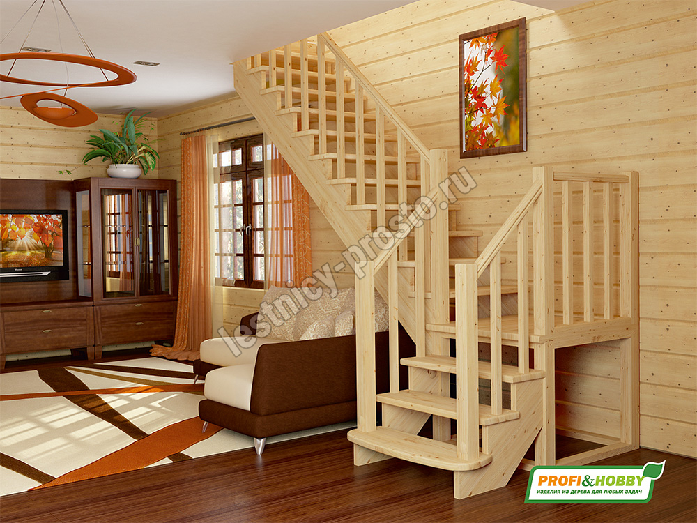 Базовый комплект включает в себя деревянные элементы лестницы и ограждения без какого-либо покрытия.