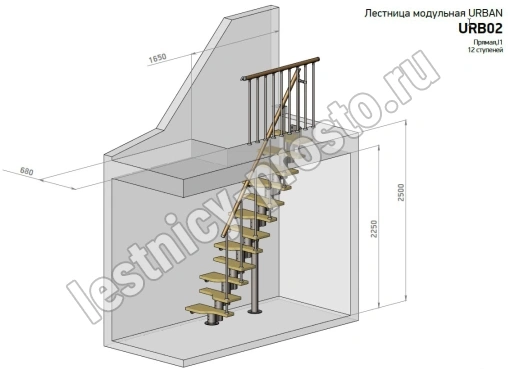 Лестница Prosto Urban Black гусиный шаг 700 мм с поручнем ПВХ, h234-336 см (13 ступеней), ясень