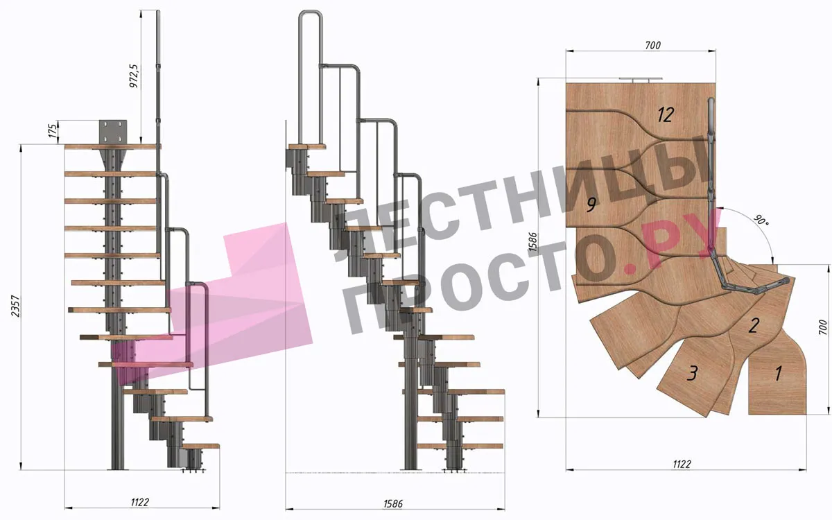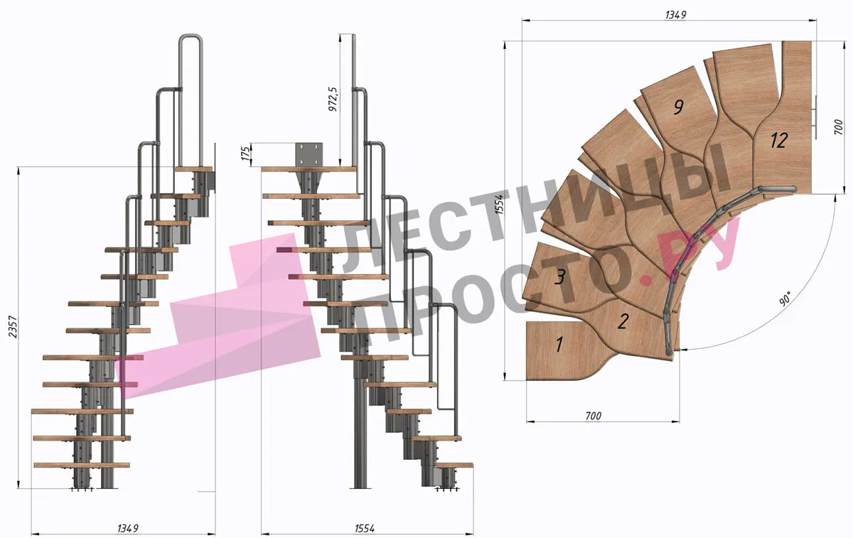 | Лестница Prosto Urban Black гусиный шаг 700 мм, h216-312 см (12 ступеней), бук |