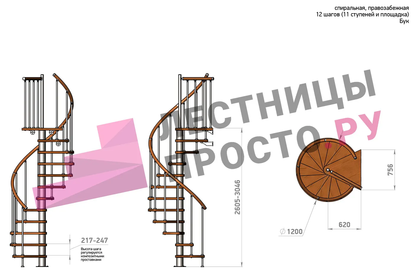Винтовая лестница Prosto Spiral Black D120см, h260.5-304.6 см, бук