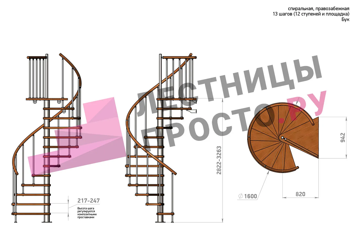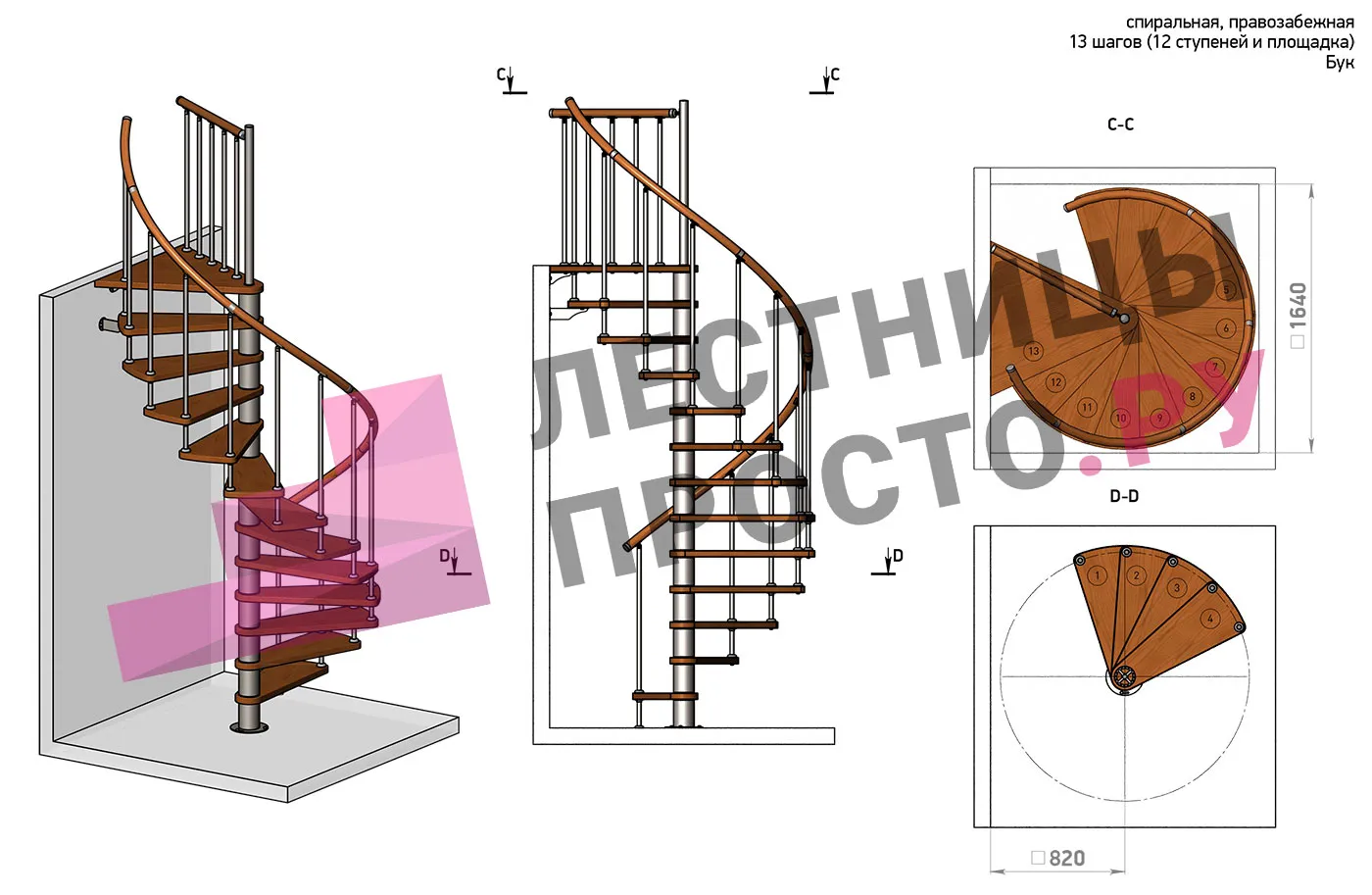 Правая, d=160см, 12 ступеней + площадка