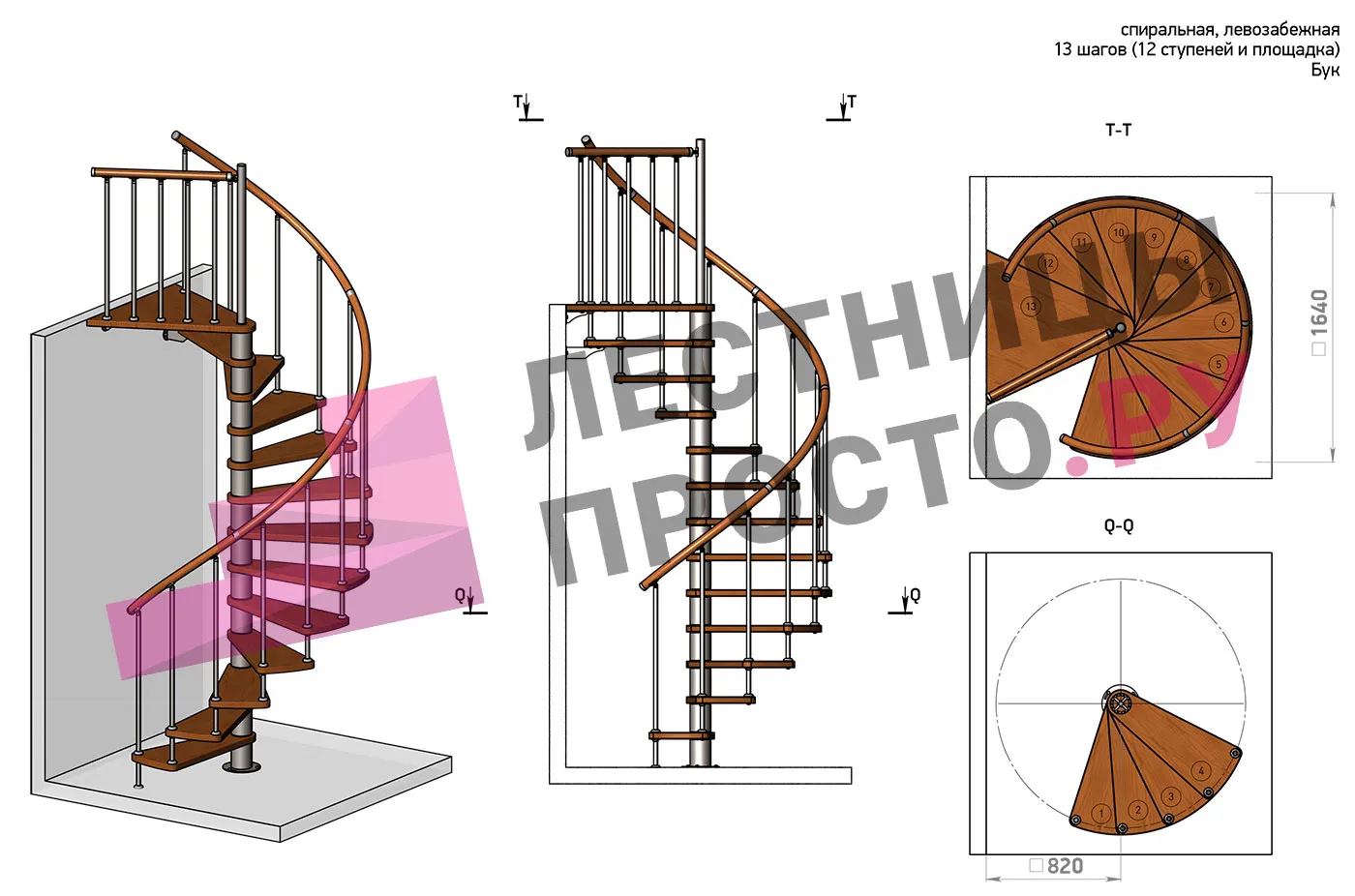Левая, d=160см, 12 ступеней + площадка